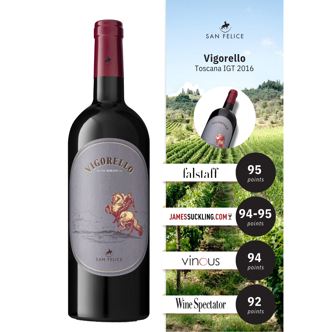Vigorello Supertuscan od San Felice, první ze Supertuscan vín, bylo vytvořeno v roce 1968 a symbolizuje revoluční změnu ve vinařství Toskánska. Toto výjimečné víno pochází z idylických vinic ve srdeční části Toskánska a je vyráběno vinařstvím San Felice, které je známé svou inovativní přístupem a respektem k historii. Vigorello bylo první víno v regionu, které kombinovalo místní odrůdu s mezinárodními odrůdami, čímž definovalo nový styl vysokokvalitních toskánských vín známých jako Supertuscan.