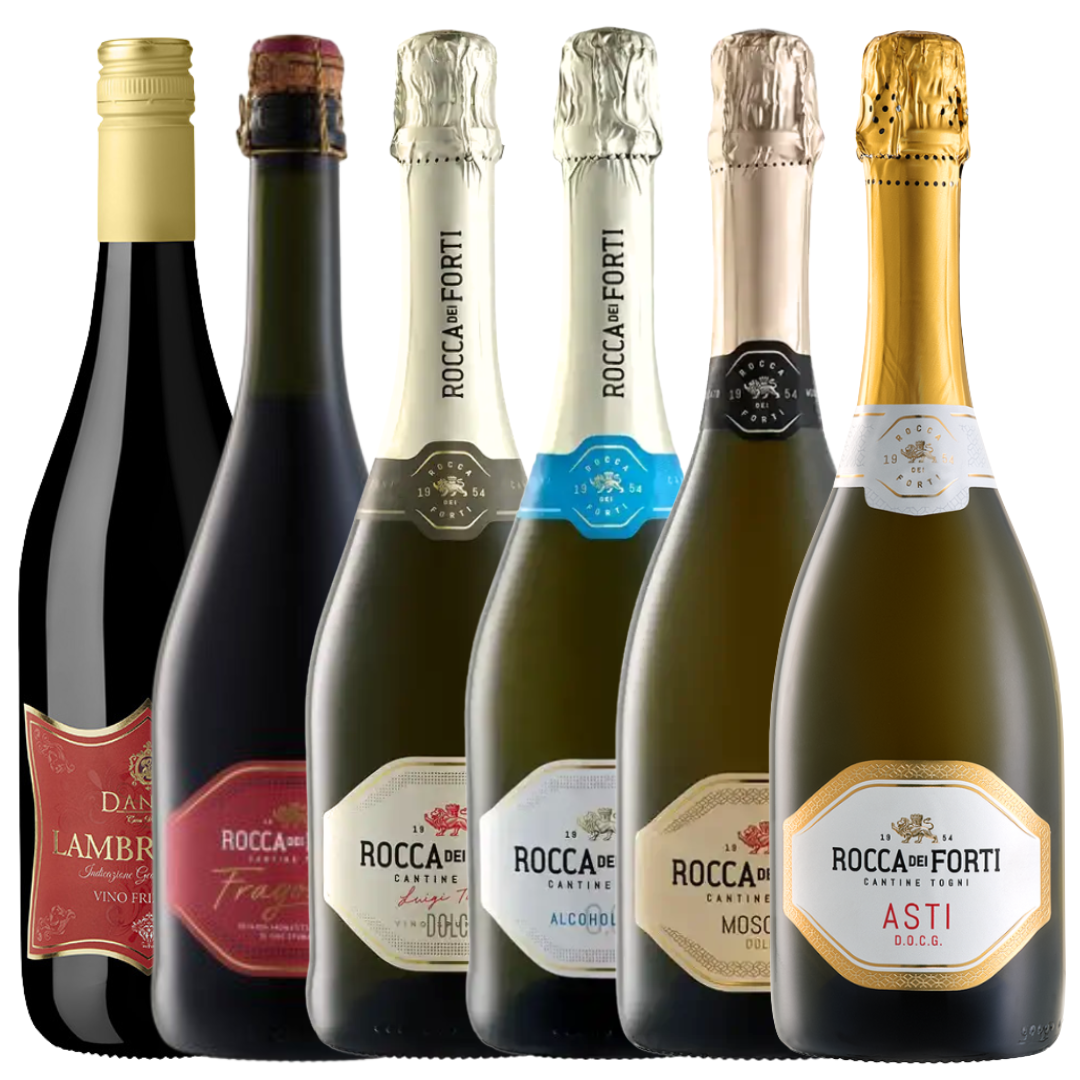 V balíčku najdete 6 šumivých vín – 5 sladkých alkoholických a 1 nealkoholický sycený nápoj. Těšit se můžete na vína od apelace DOC až po nejvyšší DOCG. Zastoupena jsou tradiční bílá vína i jedno netradiční červené šumivé víno, které zaujme svou jemností, příjemnou strukturou a lahodnou jahodovou chutí.